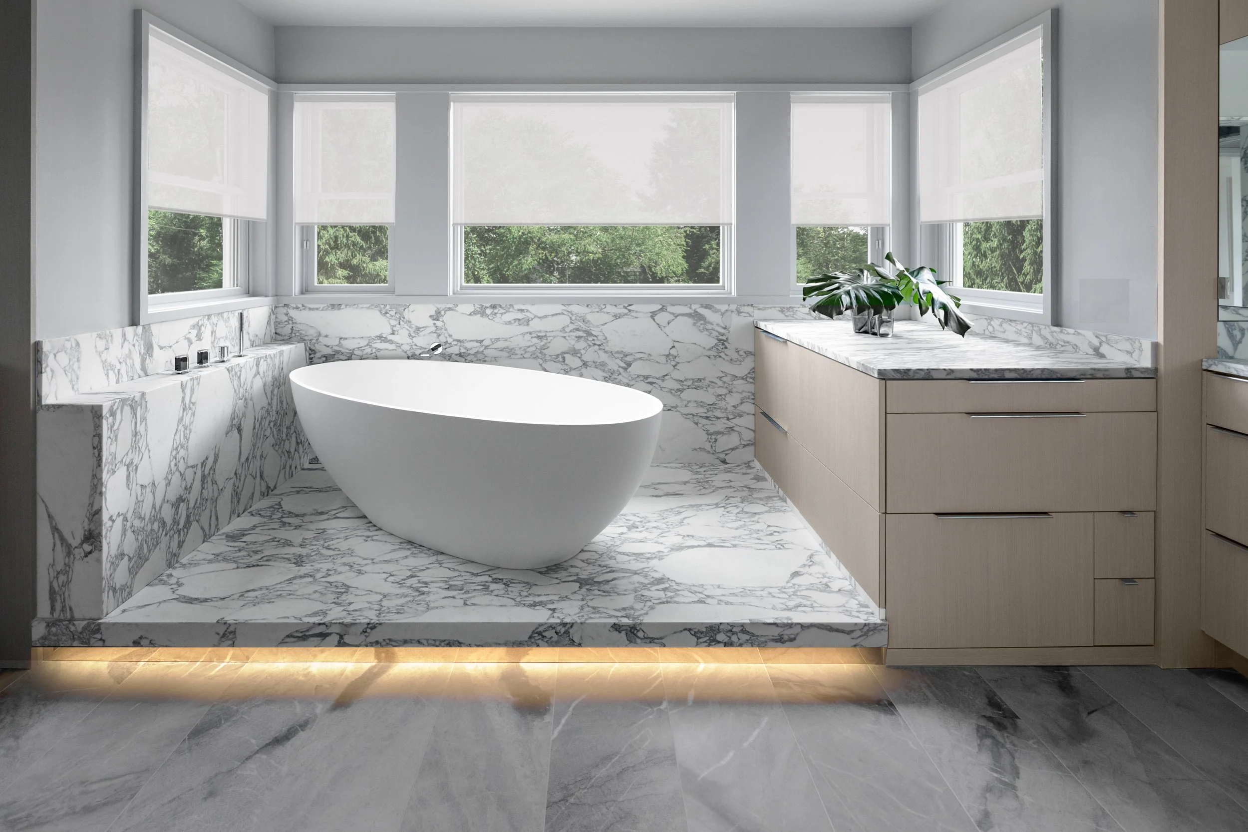 Light stained white oak and grey-hued natural stone slabs set a tone of serenity and cohesion. Clever stone and millwork details are at once functional storage and formal sculpture. Kitchen and bathroom millwork by Bilotta Kitchens.